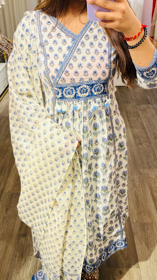 Beautiful off-white cotton printed anarkali suit set with embroidery & lace work