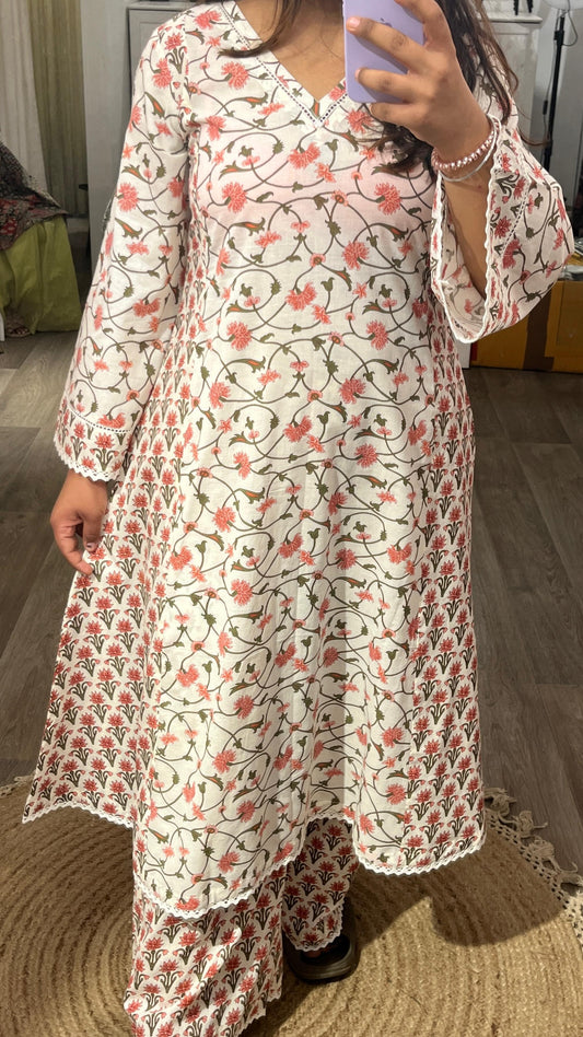 Floral hand block printed anarkali with doriya dupatta and bottoms