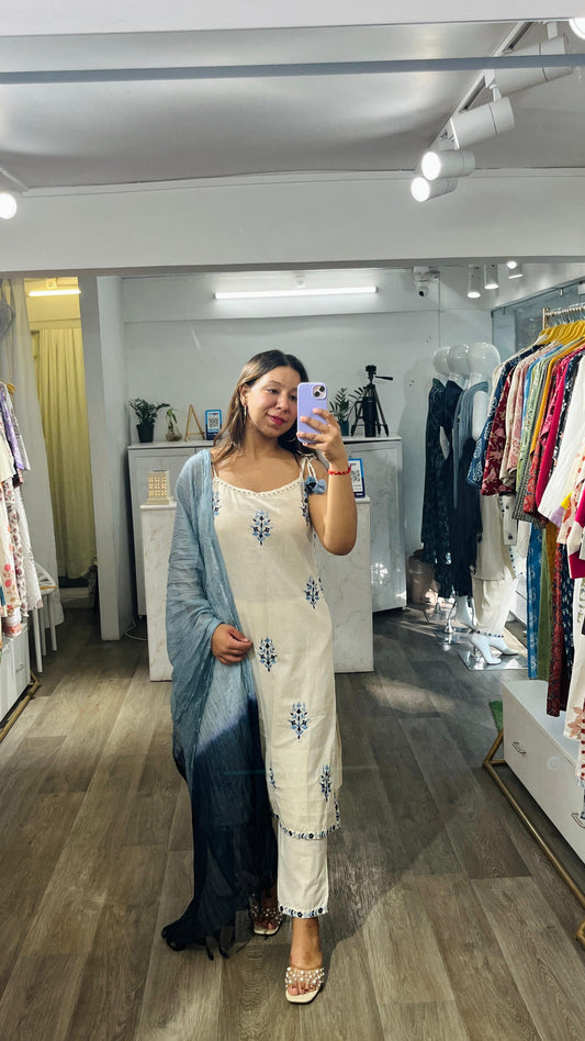 Off white-blue cotton suit set with adjustable straps